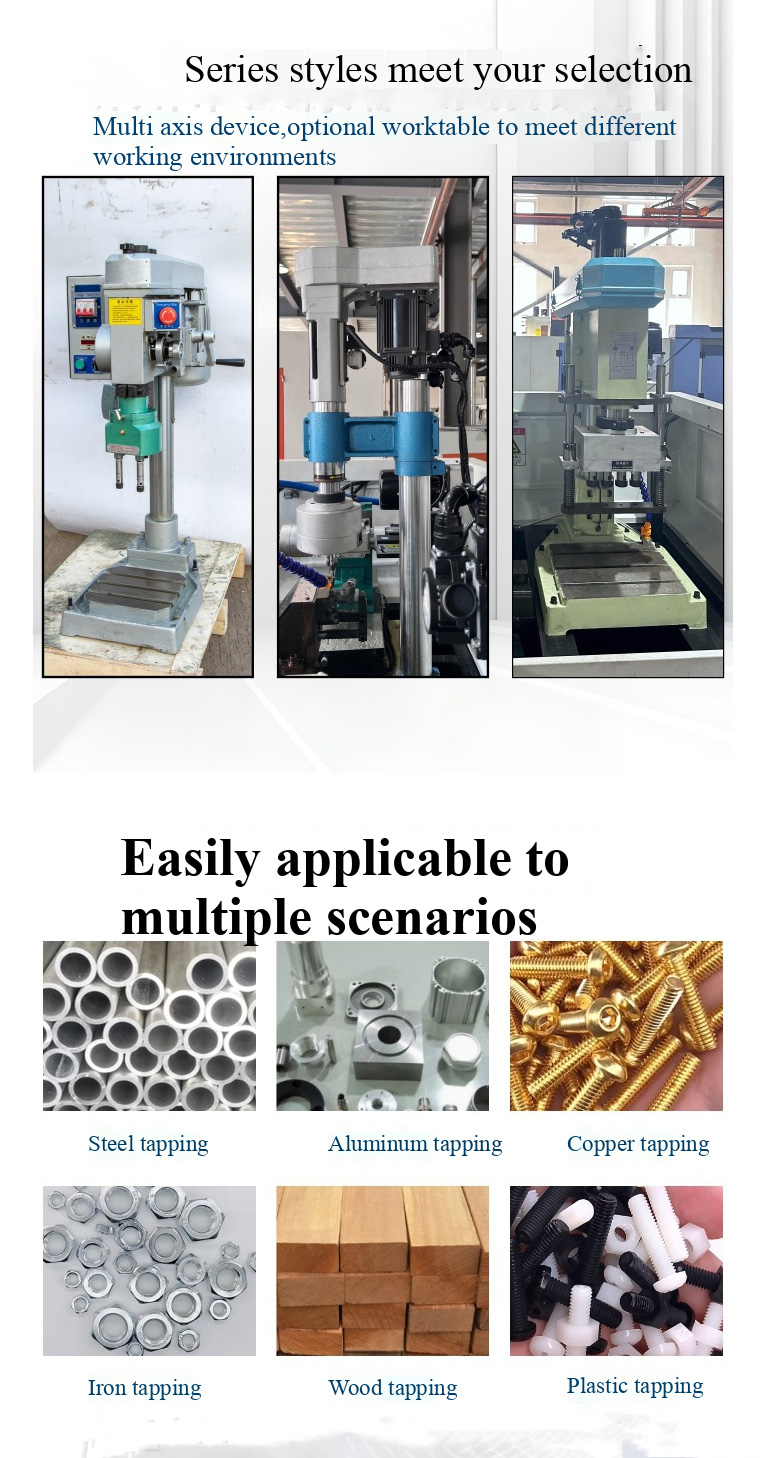 일반적인 다축 시추기 및 일반적인 드릴링 머신 (벤치 드릴, 수직 드릴, 방사형 드릴, 드릴링 및 밀링 머신, 직접 모터 연결, 파워 헤드 등을 포함하여 모두 설치할 수 있음)은 전원이 충분한 한 한 번에 몇 ~ 10 ~ 20 개의 구멍 또는 스레드를 처리 할 수 있으므로 태핑 또는 드릴링의 생산 및 가공 효율성을 크게 향상시킬 수 있습니다.